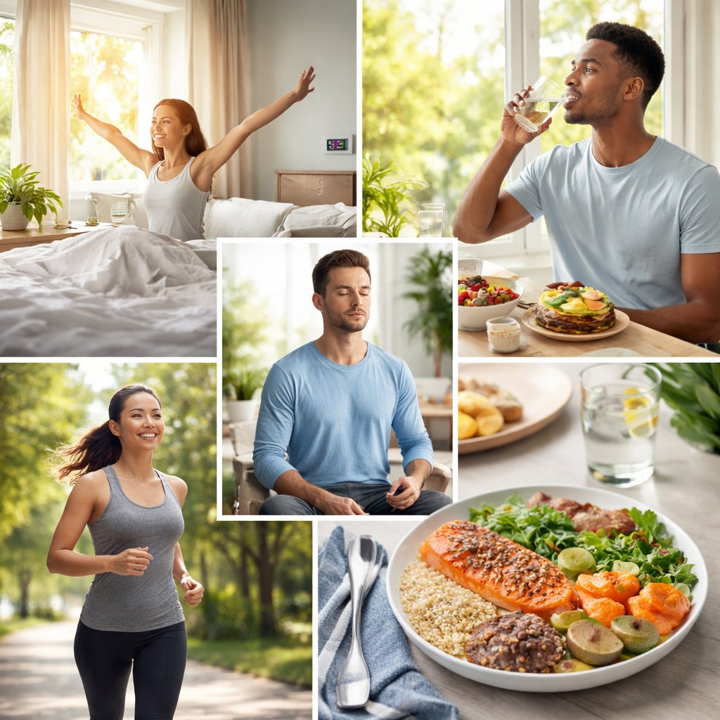 Get 10–30 minutes of outdoor light within 30–60 minutes of waking. Natural light in the morning strongly anchors your circadian rhythm and suppresses melatonin for clearer wakefulness.
